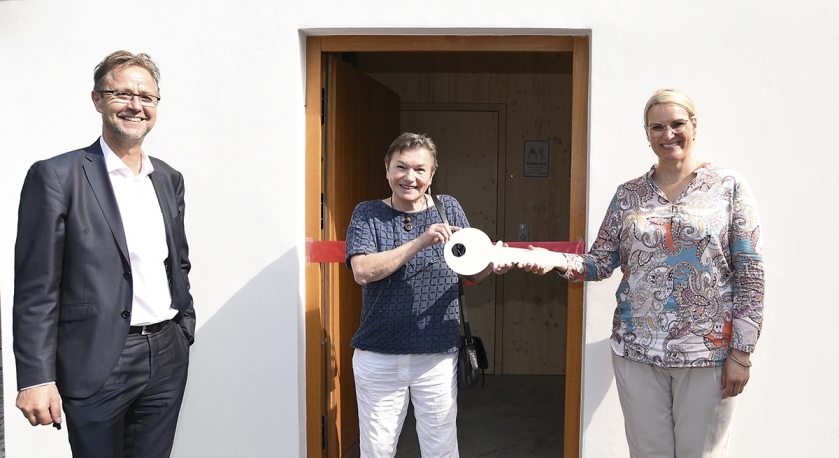 Übergabe des symbolischen Schlüssel am 17.09.2020 aus der Hand von Frau Oberbürgermeisterin Eva Weber und Herrn Stadtbaumeister Gerd Merkle an Renate Rampp.